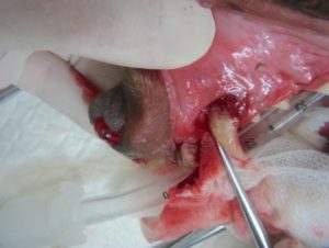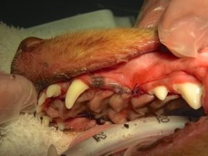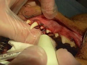↓2本の歯を抜歯した後に、腐肉(壊死した歯肉や骨)を切除しキレイにした後、歯科抗生物質を充填して歯肉縫合しました。