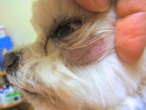 ↓下の写真は、「目の下の脱毛」で来院されました。レントゲンなどの診察の結果、上顎臼歯(いわゆる奥歯の部分)に根尖部膿瘍の存在がわかりました。歯科処置を実施し、今では元のように発毛し脱毛域は消失しました。