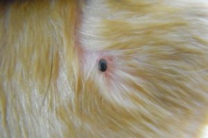 下の写真は、別の皮膚の場所についているマダニです。噛みつかれている周辺の皮膚が赤く炎症を起こし始めています。