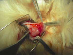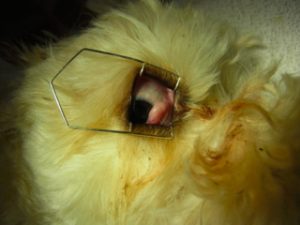 眼科手術専用の器具で眼を開いておきます。ちょっと痛々しい感じがしますね。すこしの辛抱です。(※麻酔がかかっていますので、わんちゃんに苦痛はありません。)
