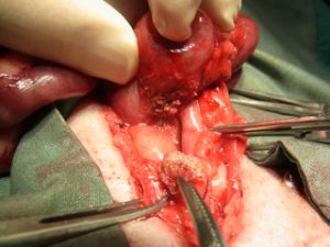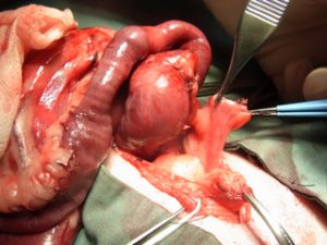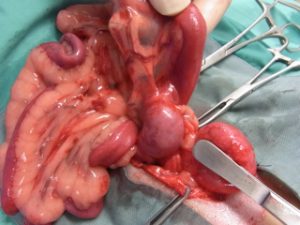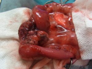 下の写真は、消化管切除の準備をしたところです。患部を整置し、切除部位を決めます。