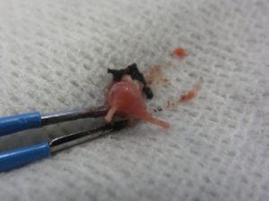 下の写真の中央部を見てください。何かヒモのような物が癒着部位から出てきました!!! 糸のようですね。この糸は絹糸(けんし)でした。(のちほど記載)