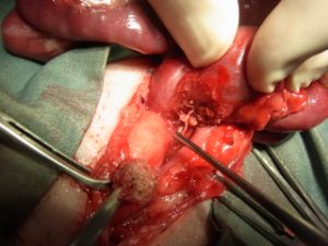 開腹所見ですが、写真右下の器具で抑えているのが「膀胱」です。指で挙上しているのが消化管です。消化管に「何か塊」がくっついています。