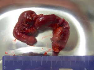 下は切除した消化管です。このあと、健常部どうしを繋ぎ合わせました。