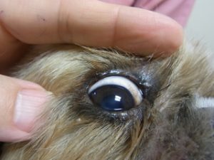 もうひとつは、腫瘤が大きくなり眼球に触れるようになると、涙が多くなったり、目やに(眼脂)が増えたりします。さらには、角膜炎が生じ眼球に大きな障害を引き起こす要因にもなり得ます。このような角膜障害を伴っている場合には、角膜の治療を平行して実施しなければならず、ご家族さまの負担も多くなってしまいます。