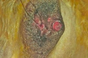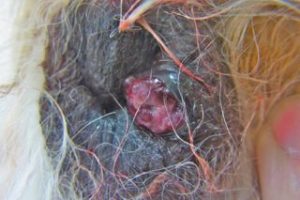 「肛門周囲腺腫」患部の切除+去勢手術。状況によっては去勢手術のみを実施し、腫瘤のサイズが小さくなってくるのを経過観察する場合もあります。