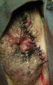 手術直前の写真です。よく見ると大きな潰瘍を要した腫瘤に加え、側に小さな腫瘤がもう一つ出来ています。