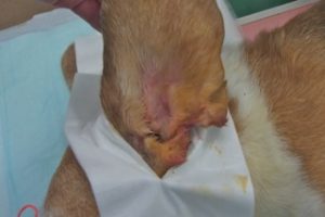 耳におできが出来たとの事で、ご来院いただきました。犬のご家族さまは患部から発する「臭い」と犬が頭を振ることによって飛び散る「分泌液」に悩ませれているとのことでした。