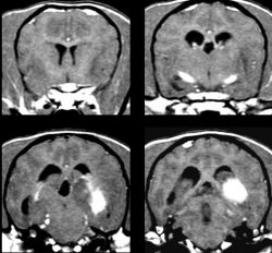 ヨークシャー・テリアによく起こるとされ「ヨーキー脳炎」と呼ばれることもあります。大脳に加え、間脳(視床)にも病変が有るのが特徴です。