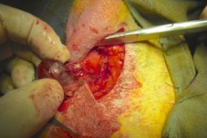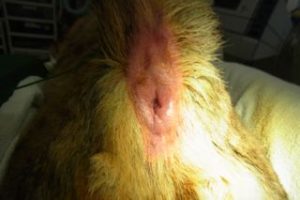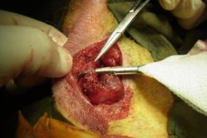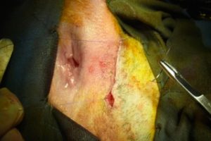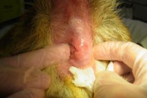 肛門部は、とてもダーティーな部位ですので、術前術中に消毒を繰り返し行います。右肛門嚢の導管開口部に消毒したガーゼを挿入しておきます。