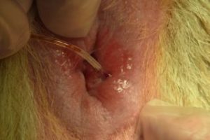 肛門腺の導管開口部より、カテーテルを挿入し分泌物の検査をすると共に