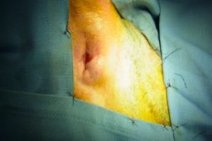 この部分は、切除部位に「体液」いわゆる水が溜まりやすく、また術後感染を引き起こしやすい部分です。深部からしっかりと縫合していきます。