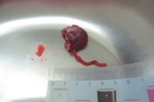 摘出した腫瘤です。術前に挿入したガーゼが付いています。少しの間は入院での管理となります。