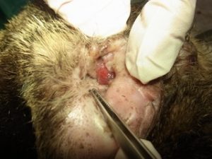 ◆しかし、病理検査の結果は「耳垢腺癌」という悪性腫瘍でした。この腫瘍の場合、獣医学的には、「耳道切除」手術が推奨されます。