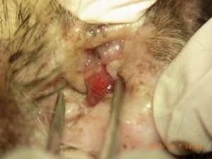 今回の猫ちゃんは、よく観察すると耳道内に赤みを帯びた「シコリ」ができていました。今まで長期にわたり治療してきたとすると、当然消炎剤や抗菌剤のお薬は使われてきたと思われます。そうすると、当院で再び外用薬や内服薬での治療を再開してみても効果は乏しいと思われます。
